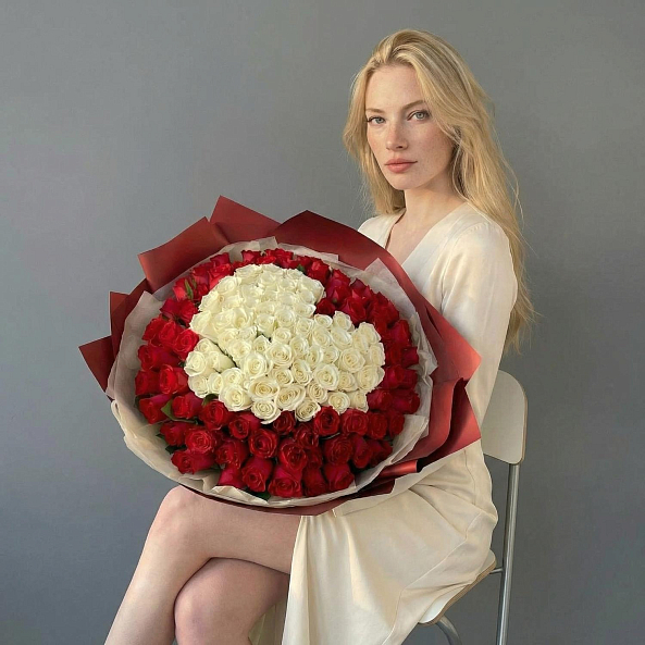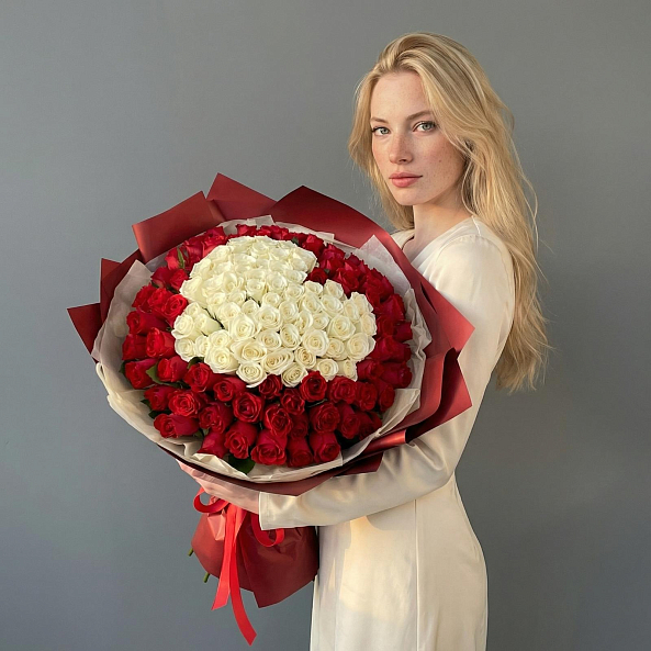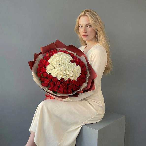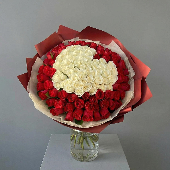 Этот изысканный букет — настоящая симфония страсти и чистоты, где 101 роза в оттенках глубокого багряного и нежного белого создает компактную композицию в форме сердца, словно застывший волшебный момент из самой романтической сказки. Высота 40 см подчеркивает изысканность и уместность букета в любом интерьере, а упаковка в красно-белую кальку с атласной лентой добавляет элегантности и символизирует вечную любовь.