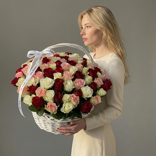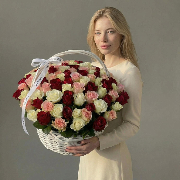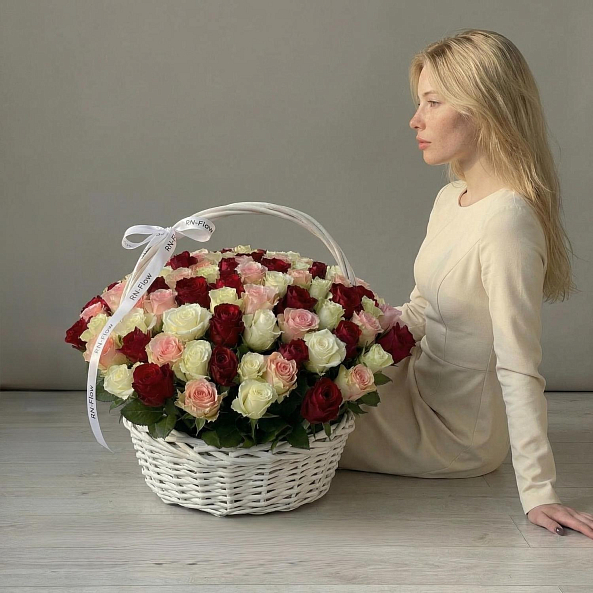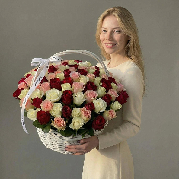 101 роза Микс в корзине.