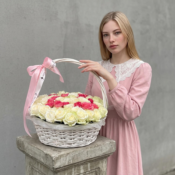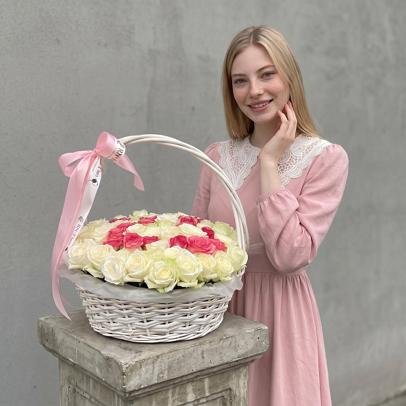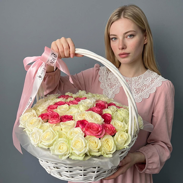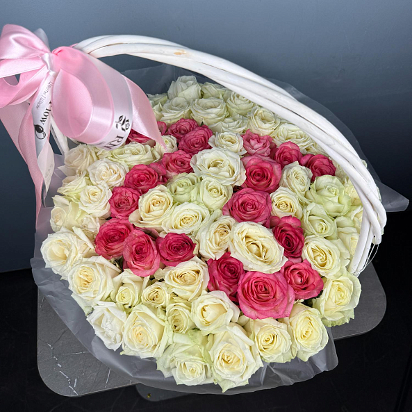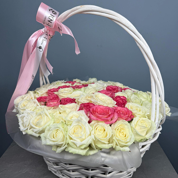 Этот уникальный букет — настоящая симфония любви и персонализации, где 101 роза в оттенках кремового и нежно-розового создает объемную композицию в форме персонализированных цифр ко дню рождения, словно застывший волшебный момент из самой личной истории. Каждый бутон, от бархатистых лепестков до свежих зеленых стеблей, дарит ощущение тепла и глубины чувств, а белая плетеная корзина с розовой лентой «RN-Flow» подчеркивает статус подарка, который запомнится надолго.