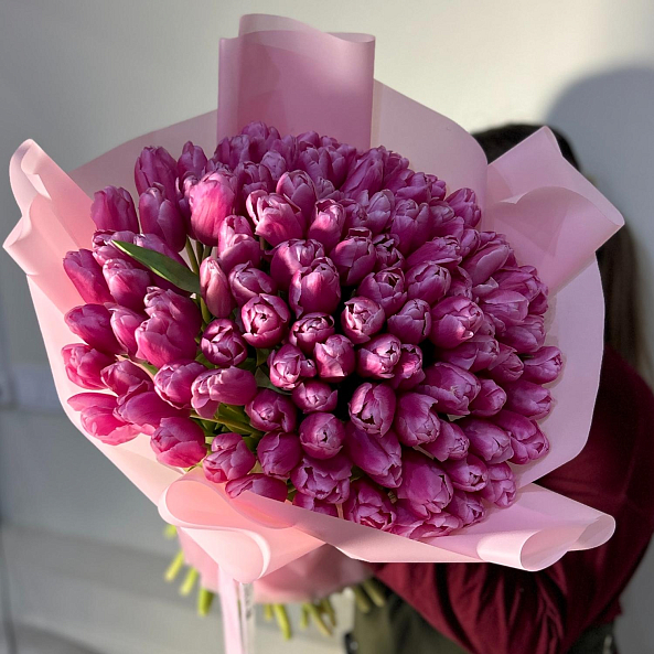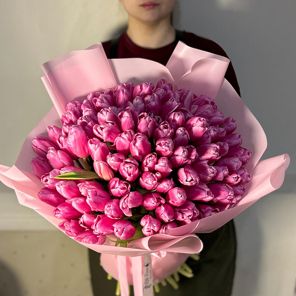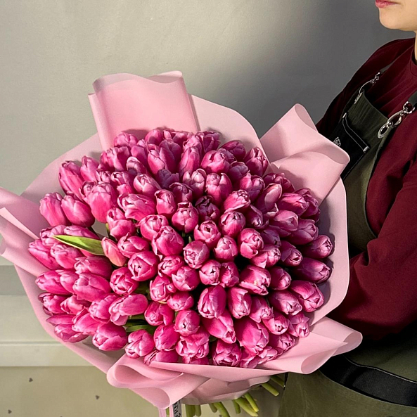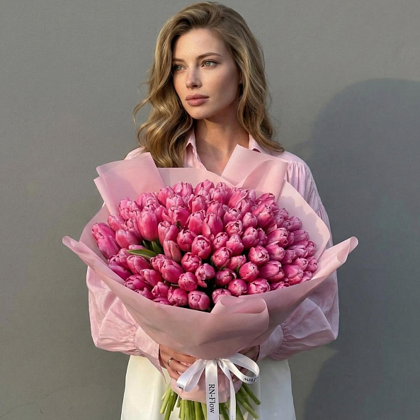 Этот изысканный букет из 101 крупных розовых гладких тюльпанов — воплощение величественной нежности, словно застывший волшебный рассвет в розовых тонах. Каждый лепесток, с его идеально гладкой текстурой и насыщенным розовым оттенком, напоминает живую драгоценность, а мощные стебли подчеркивают их элегантную силу. Плотно собранные в компактную композицию, тюльпаны создают образ минималистичной роскоши, который завораживает своей простотой и глубиной. Упакованный в нежно-лиловую кальку с атласной лентой «RN-Flow», букет выглядит лаконично и стильно, идеально дополняя как повседневный образ, так и особый момент.