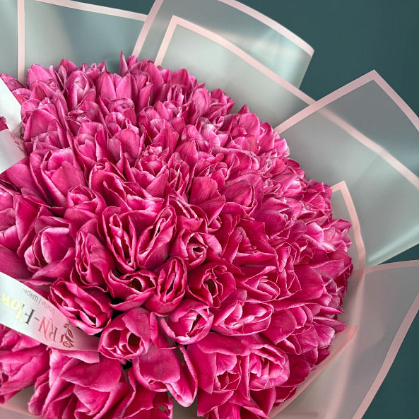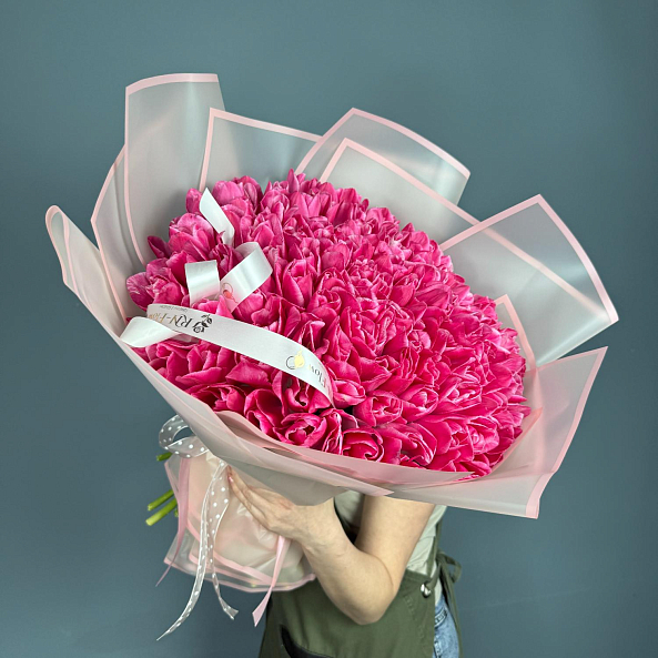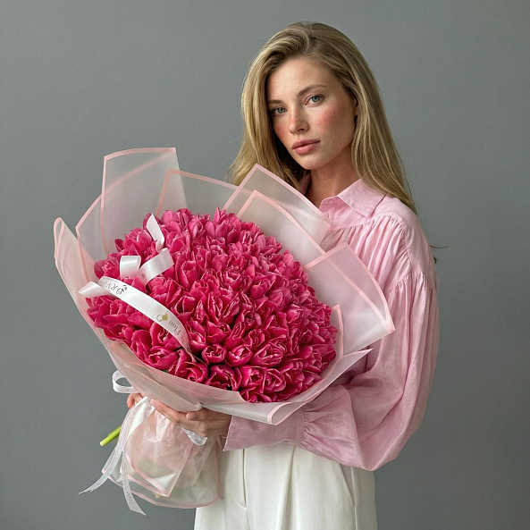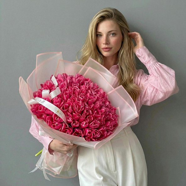 Этот роскошный букет из 101 розово-белого гладкого тюльпана — воплощение изысканной элегантности и утонченной гармонии, словно застывший волшебный закат на фоне нежных облаков. Каждый лепесток, с его идеально гладкой текстой и плавным переходом от нежного розового к чистому белому, дарит ощущение тепла и спокойствия, а плотно собранные цветы создают объемную композицию, которая завораживает с первого взгляда. Упакованный в розово-белую кальку с атласной лентой «RN-Flow», букет выглядит как произведение искусства — идеально дополняя романтический образ или торжественное мероприятие.