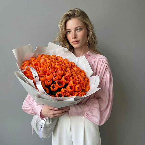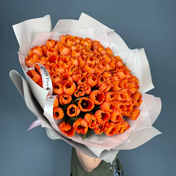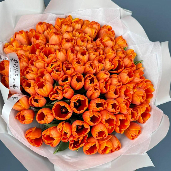Этот роскошный букет из 101 оранжевого гладкого тюльпана — настоящий взрыв энергии и радости, словно застывший волшебный закат. Каждый лепесток, с его насыщенным солнечным оттенком и идеально гладкой текстурой, дарит ощущение тепла и жизненной силы, а плотно собранные цветы создают объемную композицию, которая завораживает с первого взгляда. Упакованный в прозрачную кальку с атласной лентой «RN-Flow», букет выглядит как произведение искусства — идеально дополняя романтический образ или торжественное мероприятие.