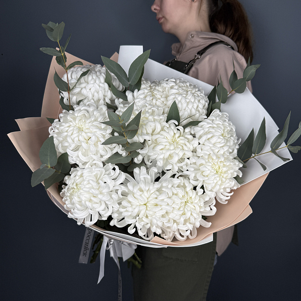 Пышные белые хризантемы и свежий эвкалипт — это не просто букет, а целая атмосфера. Идеален для тех, кто ценит простоту, доброту и гармонию.