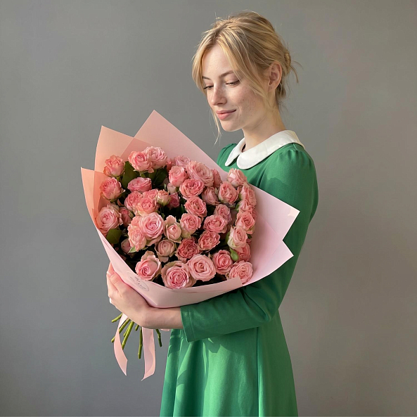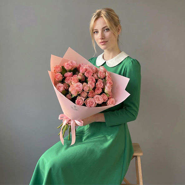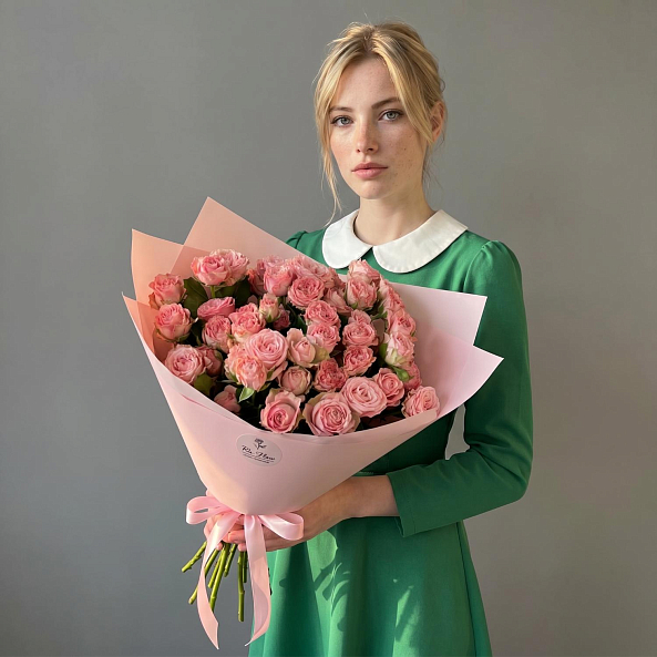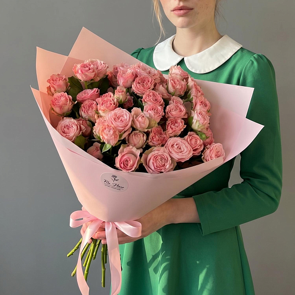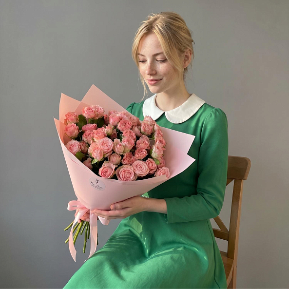11 кустовых роз "Мадам Бомбастик" 50 см в нежно-розовых тонах — это изысканная, воздушная и романтичная композиция, наполненная мягкостью и элегантностью. Идеальный букет для поздравлений, выражения любви или как трогательный подарок, подчеркивающий ваше внимание и искренние чувства.