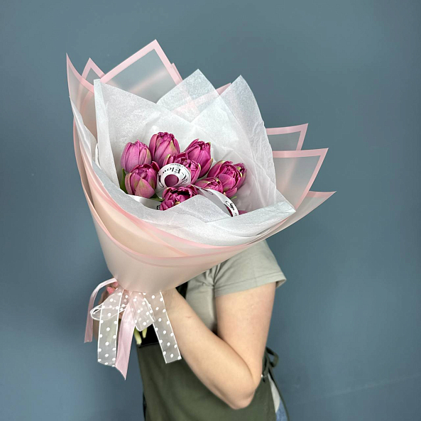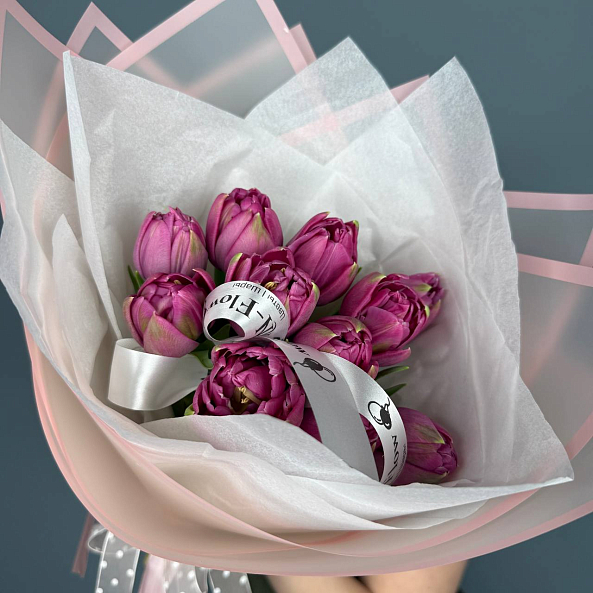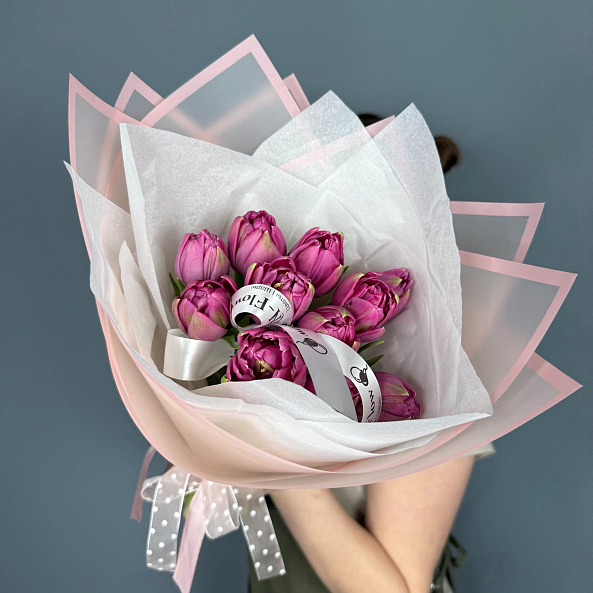 Этот роскошный букет из 11 темно-розового пионовидного тюльпана — настоящий символ вечной страсти и изысканной элегантности. Каждый бутон, с его пышными, многослойными лепестками и глубоким розовым оттенком, словно вышитый из атласа, дарит ощущение тепла и роскоши. Плотная композиция, напоминающая живой букет из сказки, завораживает объемом и глубиной, а аккуратные зеленые стебли придают естественную гармонию. Упакованный в насыщенную розовую кальку с атласной лентой «RN-Flow», букет выглядит как произведение искусства — идеально дополняя романтический образ или торжественное мероприятие.