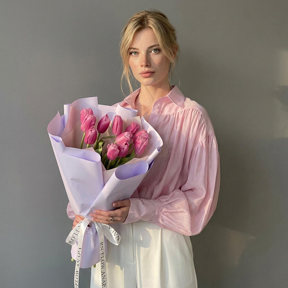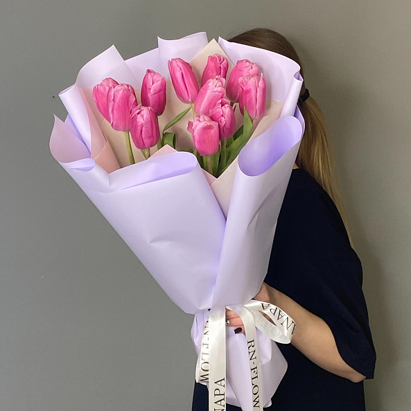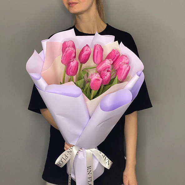 Этот изысканный букет из 11 крупных розовых гладких тюльпанов — воплощение величественной нежности, словно застывший волшебный рассвет в розовых тонах. Каждый лепесток, с его идеально гладкой текстурой и насыщенным розовым оттенком, напоминает живую драгоценность, а мощные стебли подчеркивают их элегантную силу. Плотно собранные в компактную композицию, тюльпаны создают образ минималистичной роскоши, который завораживает своей простотой и глубиной. Упакованный в нежно-лиловую кальку с атласной лентой «RN-Flow», букет выглядит лаконично и стильно, идеально дополняя как повседневный образ, так и особый момент.