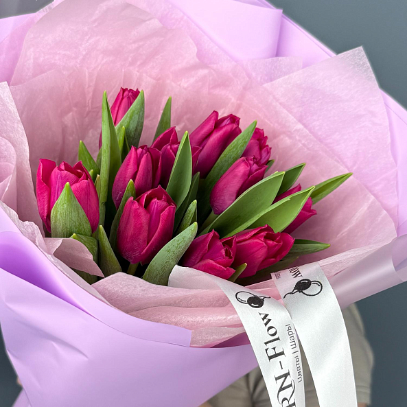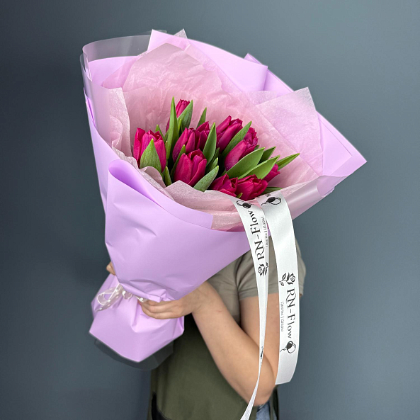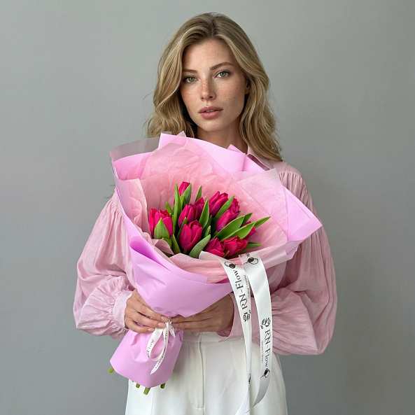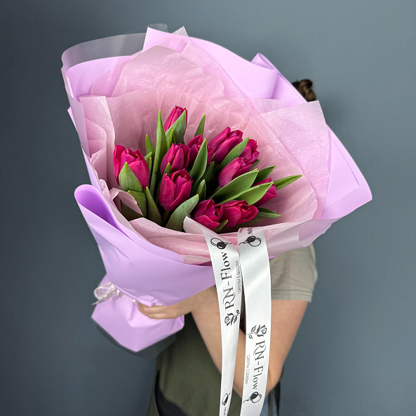 Этот изысканный букет из 11 темно-розовых гладких тюльпанов — воплощение утонченной элегантности и скромной страсти. Каждый лепесток, с его насыщенным оттенком, словно застывший в лучах закатного солнца, дарит ощущение тепла и глубины, а гладкая текстура подчеркивает роскошь и современный стиль. Плотно собранные в компактную композицию, тюльпаны создают образ минималистичной роскоши, который завораживает своей простотой и изысканностью. Упаковй в прозрачную кальку с атласной лентой «RN-Flow», букет выглядит лаконично и стильно, идеально дополняя как повседневный образ, так и особый момент.