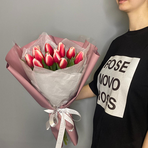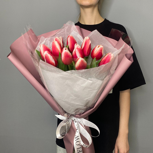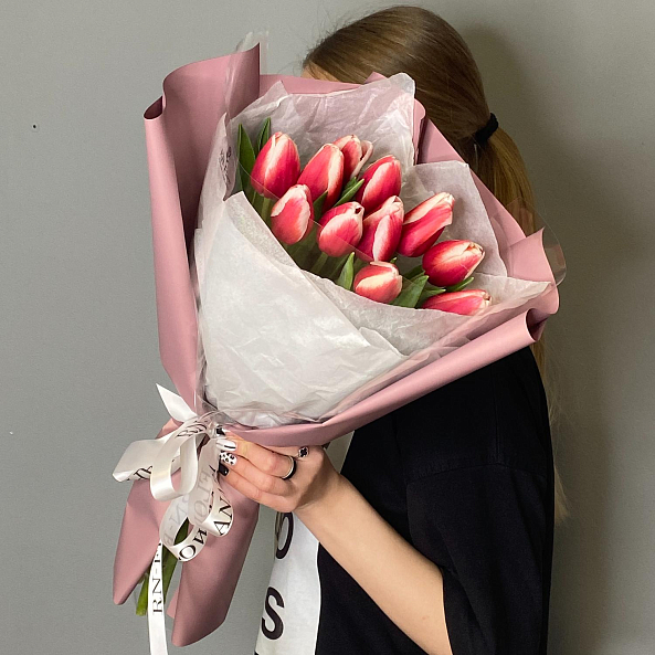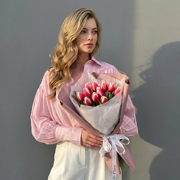 Этот изысканный букет из 11 розово-кремовых гладких тюльпанов — воплощение вечной гармонии и утонченной нежности, словно застывший волшебный закат в пастельных тонах. Каждый лепесток, с его идеально гладкой текстурой и плавным переходом от кремового к теплому розовому, дарит ощущение уюта и глубины, а аккуратные зеленые стебли придают композиции естественную свежесть. Упакованный в прозрачную кальку с атласной лентой «RN-Flow», букет выглядит лаконично и стильно, идеально дополняя как повседневный образ, так и особый момент.