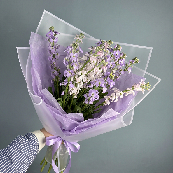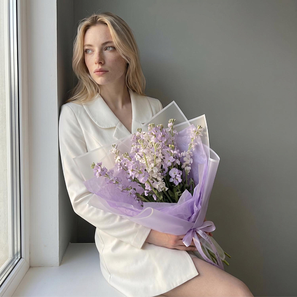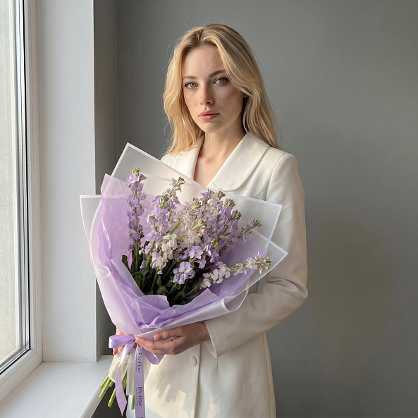 Этот изысканный букет — настоящая симфония гармонии и контраста, где 15 стеблей маттиолы «Пустошка» в сочетании лавандовых и нежно-розовых оттенков создают объемную, ароматную композицию, словно застывший момент из самого романтического уголка весеннего сада.