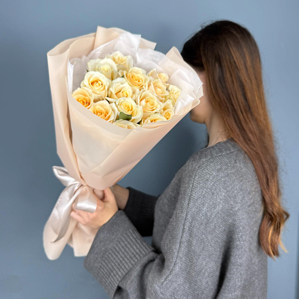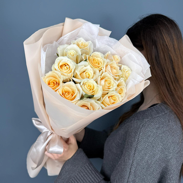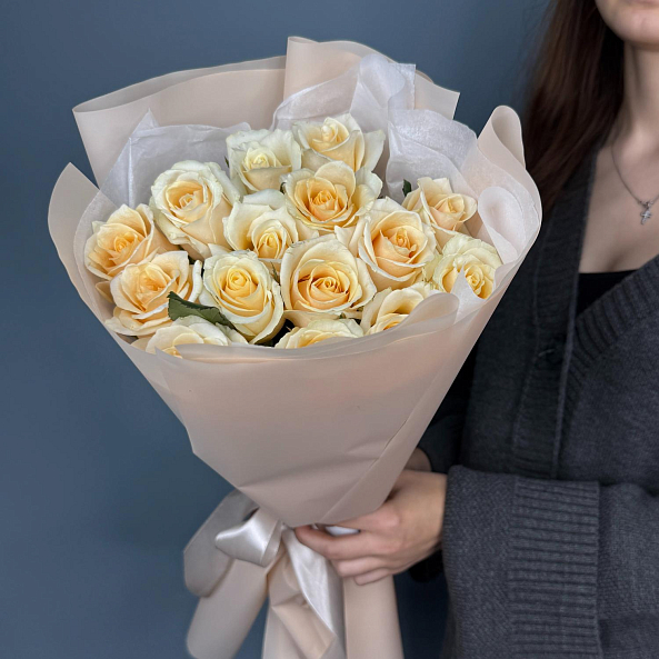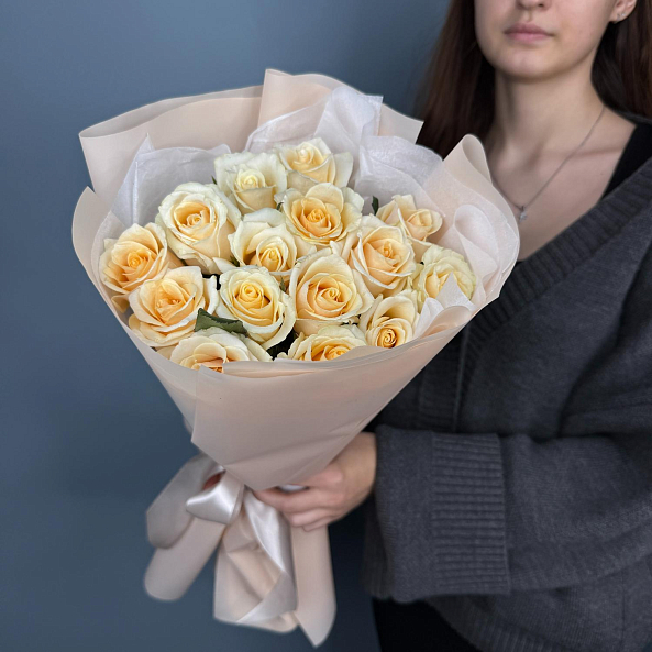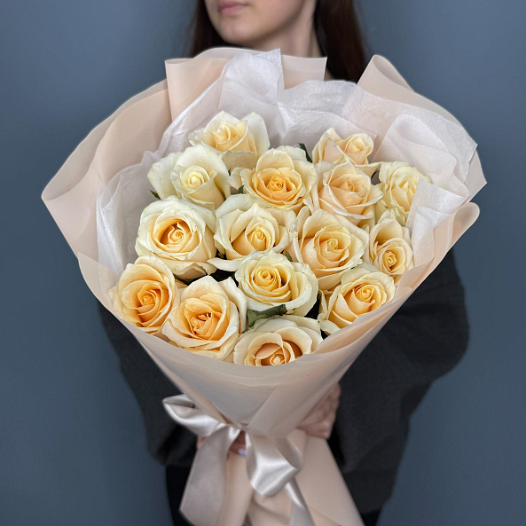 15 роз "Талея" 40 см кремового цвета в оформлении — это элегантная, нежная и изысканная композиция, наполненная светлыми тонами и атмосферой изящества. Идеальный букет для романтических поздравлений, торжественных событий или как трогательное выражение внимания и любви.