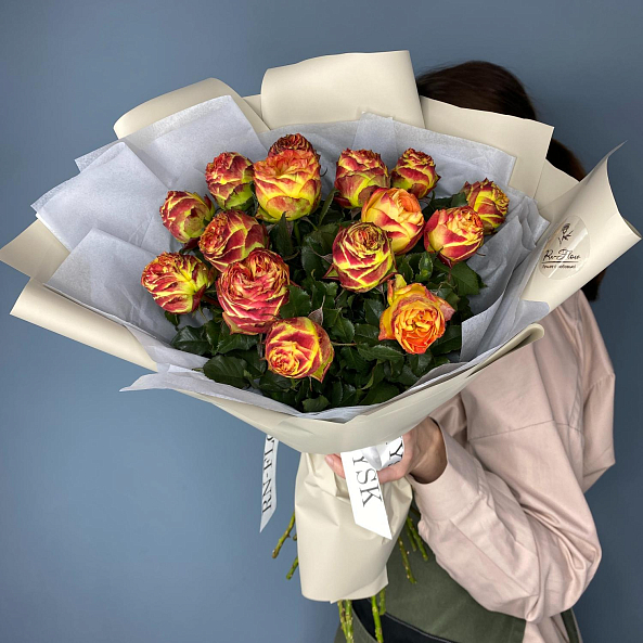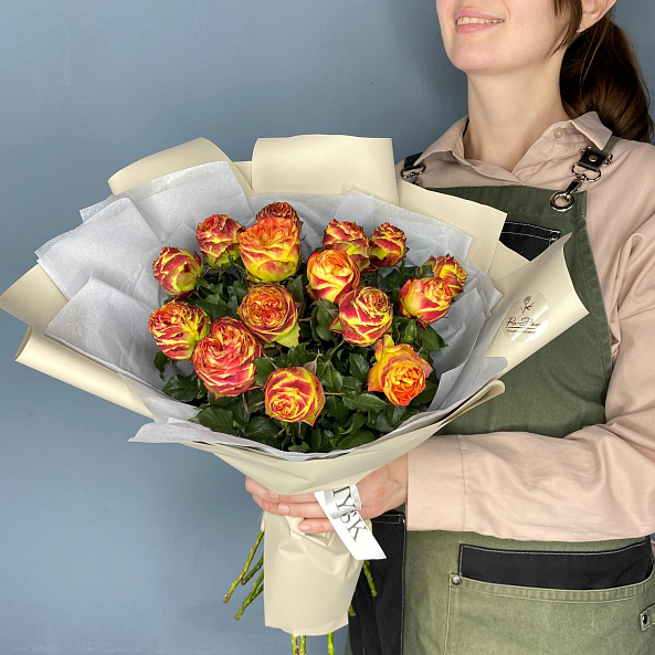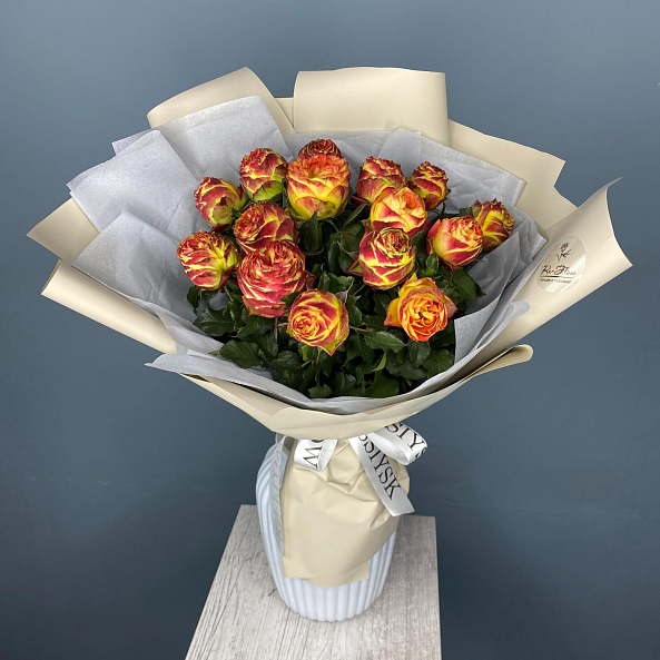 Яркая роза 40 см с пылающими оттенками оранжевого, красного и желтого — настоящий огонь страсти в одном бутоне. Идеальный выбор для тех, кто хочет подарить нечто запоминающееся и яркое.