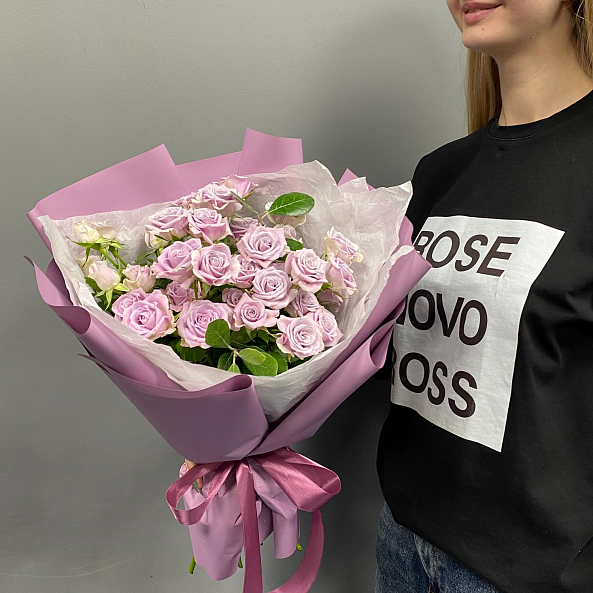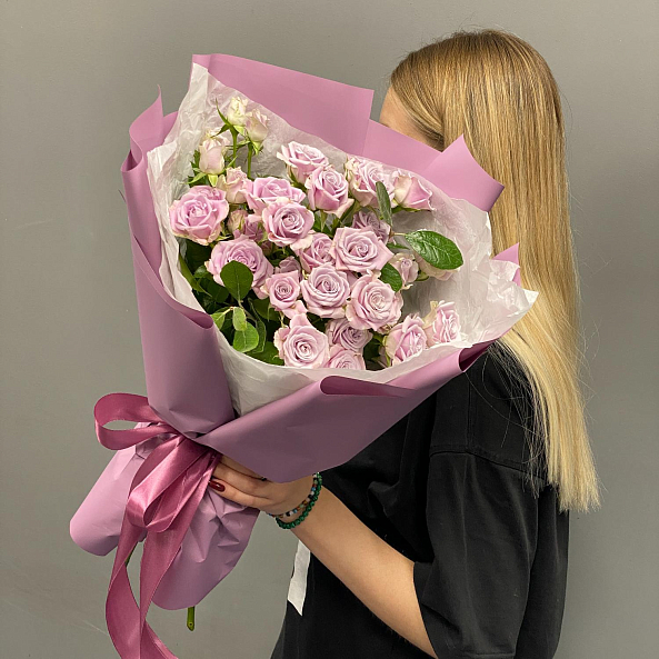 Букет из фиолетовых роз — тонкая гамма загадочности и романтики. Нежные, чуть пастельные оттенки цветов создают атмосферу утончённой красоты и спокойствия. Упакован в матовую лиловую бумагу с атласной лентой — идеальный выбор для тех, кто ценит изысканность и хочет подарить не просто цветы, а настроение. Подойдёт как для особого случая, так и для простого, но трогательного жеста.