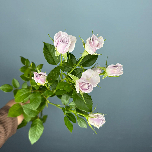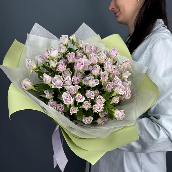 Букет из 15 кустовых роз «Сильвер Шедоу» 50 см — нежная симфония лиловых оттенков с серебристым шармом. Пышные, словно мини-пионы, цветы на длинных стеблях создают объёмный, воздушный и очень женственный букет. Упакован в светло-зелёную бумагу с лентой — идеален для романтического подарка, дня рождения или просто чтобы порадовать близкого человека. Элегантность, свежесть и изысканность в каждой детали.