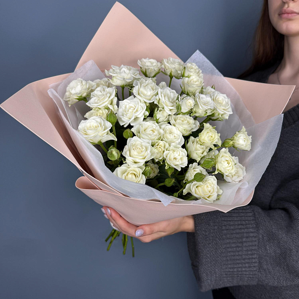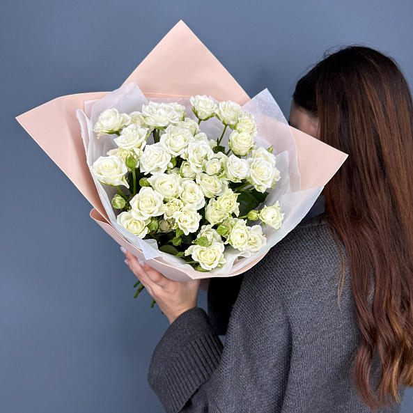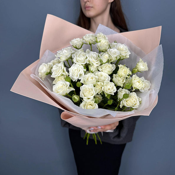 Изящный букет из 15 кустовых роз сорта "Сноуфлейк" (Snowflake) — это ода чистоте, свету и нежности. Белоснежные, пышные бутоны напоминают мини-пионы и создают ощущение зимней свежести и весенней надежды. Идеальный выбор для важных моментов и тёплых чувств.