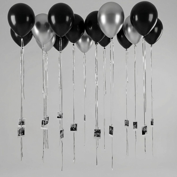 Этот уникальный набор из 15 фольговых шаров в черном и серебряном оттенках — не просто декор, а живой символ памяти и личной истории. Каждый шар, выполненный из прочного материала, дополнен вашими личными фото, прикрепленными на длинных атласных лентах или лентах дождик. Набор создает атмосферу глубоких эмоций и утонченной элегантности, идеально дополняя торжественные или памятные моменты.