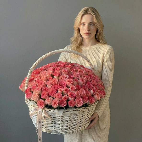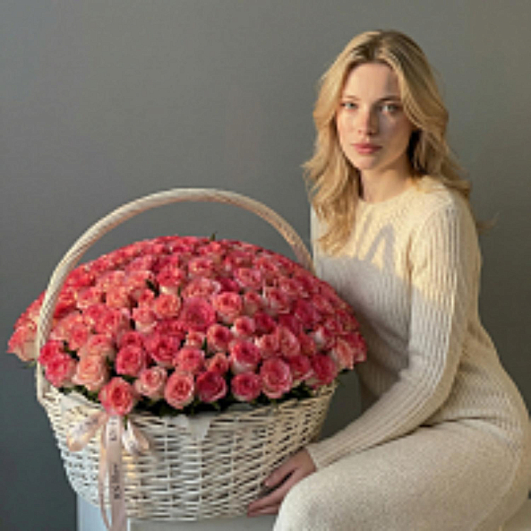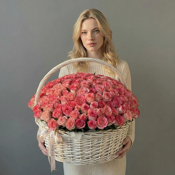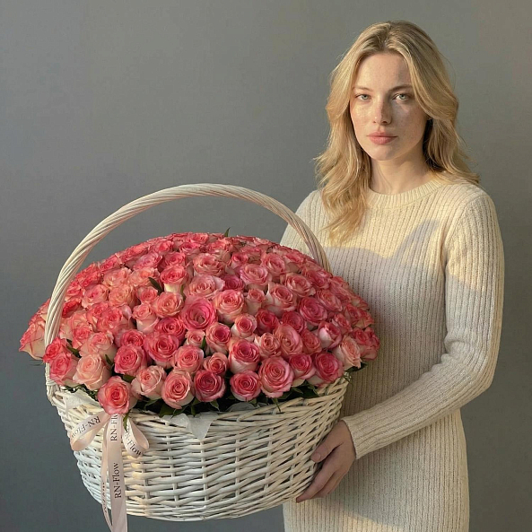 Этот изысканный букет — настоящая симфония нежности и страсти, где 201 роза в оттенке «Барбадос» создает объемную и гармоничную композицию, словно застывший волшебный закат в персиково-розовых тонах. Каждый бутон, от бархатистых лепестков до идеальной формы, дарит ощущение тепла и глубины чувств. Упакованный в белую плетеную корзину с атласной лентой, букет выглядит лаконично и стильно, идеально дополняя как свадебный образ, так и романтический вечер.