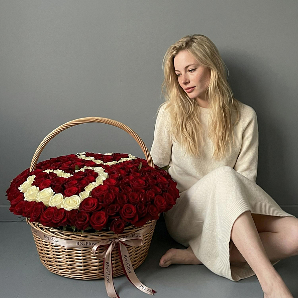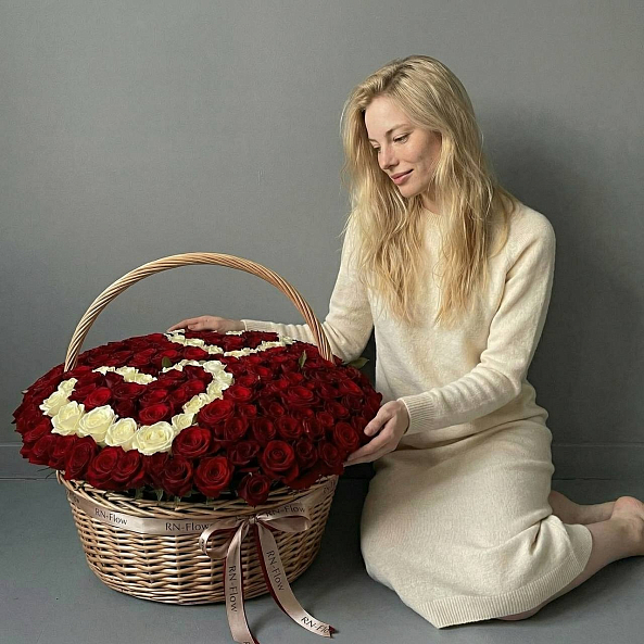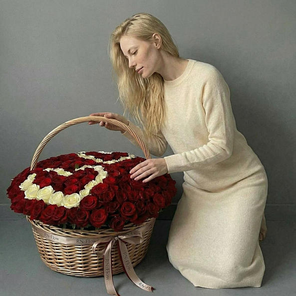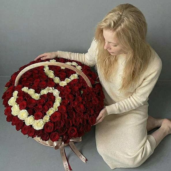 Этот монументальный букет — настоящая симфония безграничной страсти и вечной любви, где 201 насыщенная красная роза в идеальной форме создает роскошную композицию с сердцем из белых роз в центре, словно застывший волшебный момент из самой романтической сказки. Каждый бутон, от бархатистых лепестков до свежих зеленых стеблей, дарит ощущение тепла и глубины чувств, а плетеная корзина с лентой «RN-Flow» подчеркивает статус подарка, который запомнится на всю жизнь.