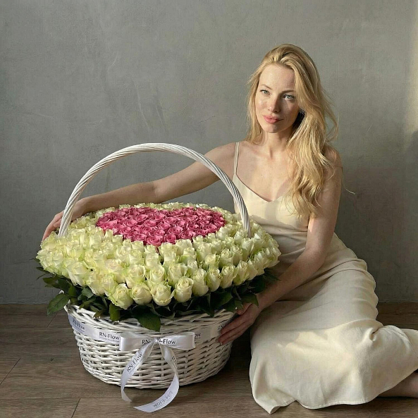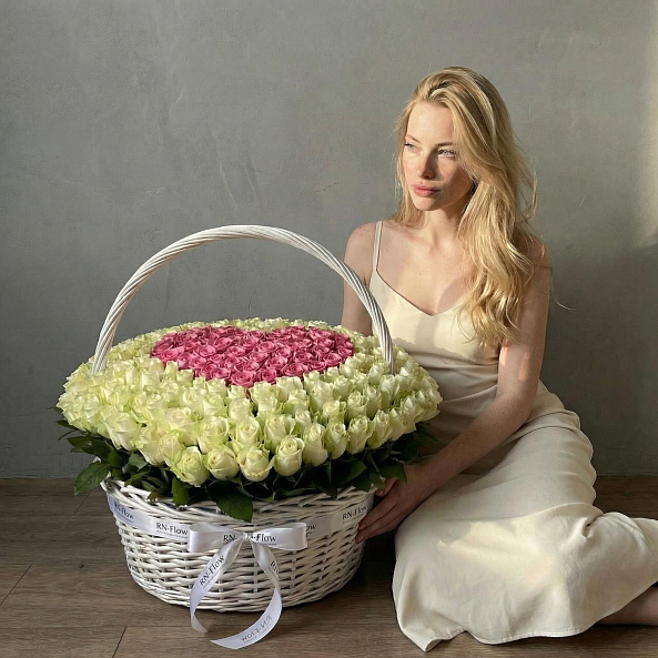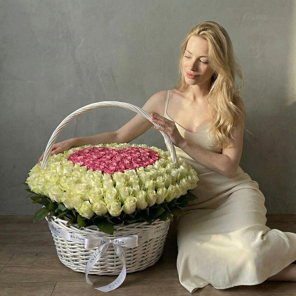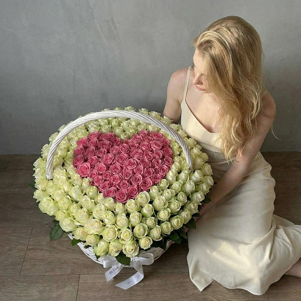 Этот изысканный букет — настоящая симфония любви и нежности, где 201 роза в оттенках нежного белого и розового создает объемную композицию с сердцем в центре, словно застывший волшебный момент из самой романтической сказки.