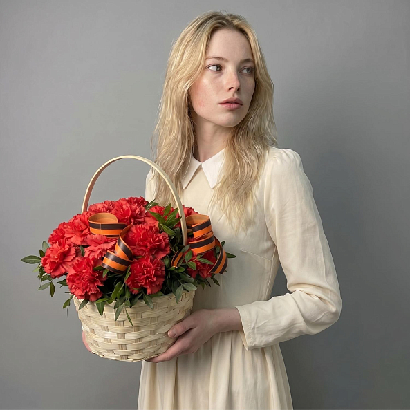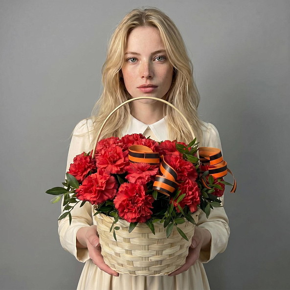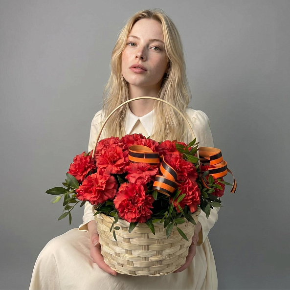 Букет «Красный Патриотизм: 21 Красная Гвоздика в Корзине с Георгиевской Лентой»