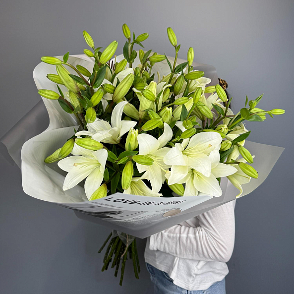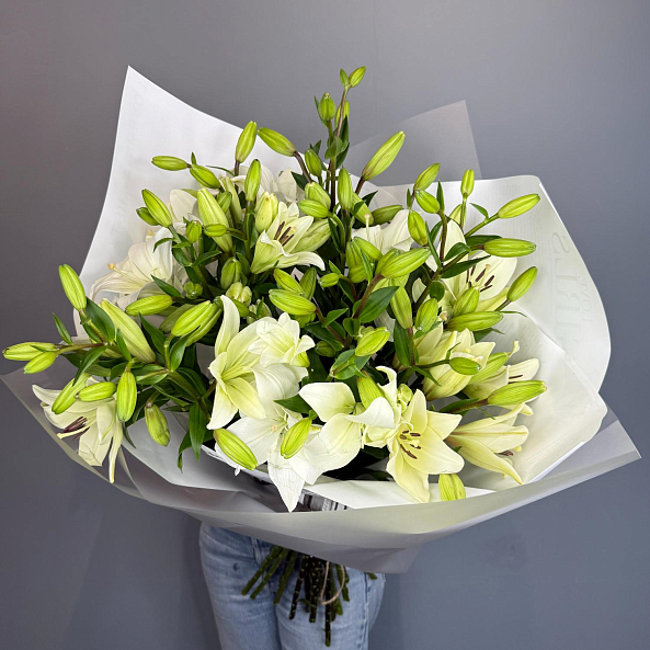 Пышный букет из свежих белых лилий — символ чистоты, благородства и искренних чувств. Каждый цветок словно только что распустился — с нежными лепестками и зелёными бутонами, обещающими долгое цветение. Идеально подходит для романтического подарка, выражения благодарности или торжественного случая.