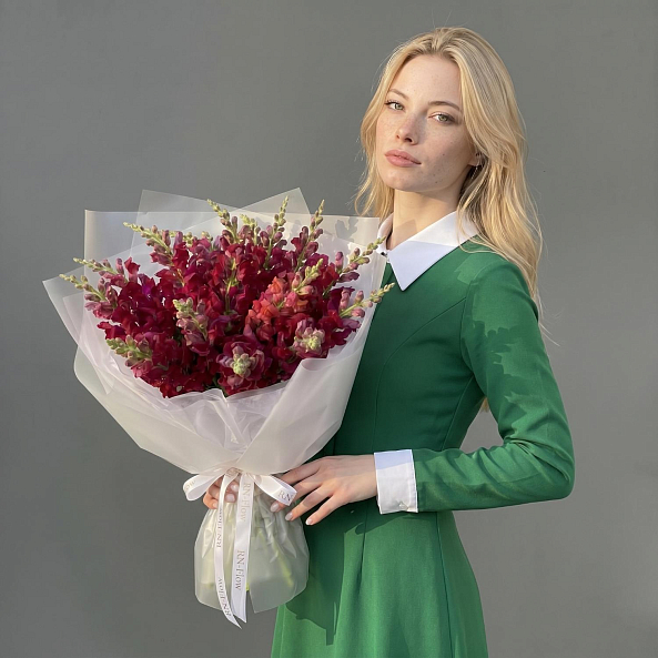 Этот изысканный букет — настоящая симфония ярких эмоций и жизнелюбия, где 21 антиринум (львиный зев) в оттенках бордового, фиолетового, розового и малинового создают объемную, играющую композицию, словно застывший момент из самого радужного дня. Каждый цветок, с его миниатюрными «ротиками» и насыщенными оттенками, дарит ощущение тепла и позитива, а свежие зеленые стебли подчеркивают естественную гармонию.