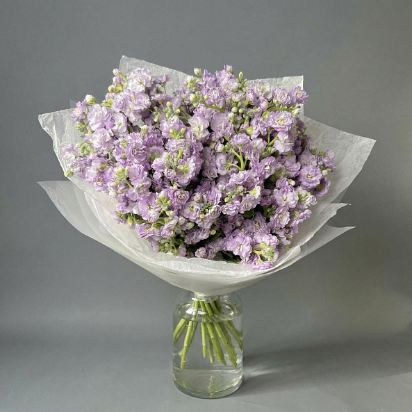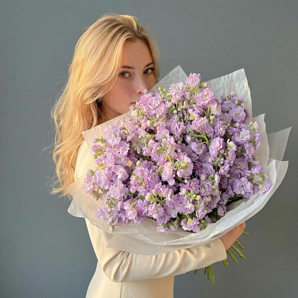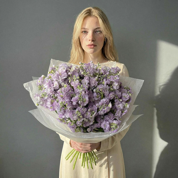 В этом трогательном букете соединились изящество, утончённость и нежный аромат. 21 маттиола лавандового оттенка — это не просто подарок, а настоящее признание в любви, восхищении и внимании к деталям.