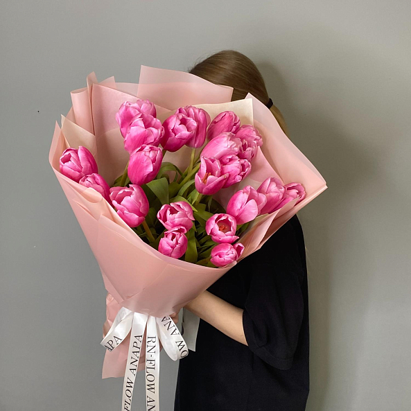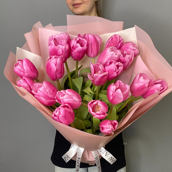 Этот изысканный букет из 21 крупных розовых гладких тюльпанов — воплощение величественной нежности, словно застывший волшебный рассвет в розовых тонах. Каждый лепесток, с его идеально гладкой текстурой и насыщенным розовым оттенком, напоминает живую драгоценность, а мощные стебли подчеркивают их элегантную силу. Плотно собранные в компактную композицию, тюльпаны создают образ минималистичной роскоши, который завораживает своей простотой и глубиной. Упакованный в нежно-лиловую кальку с атласной лентой «RN-Flow», букет выглядит лаконично и стильно, идеально дополняя как повседневный образ, так и особый момент.