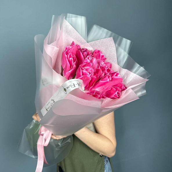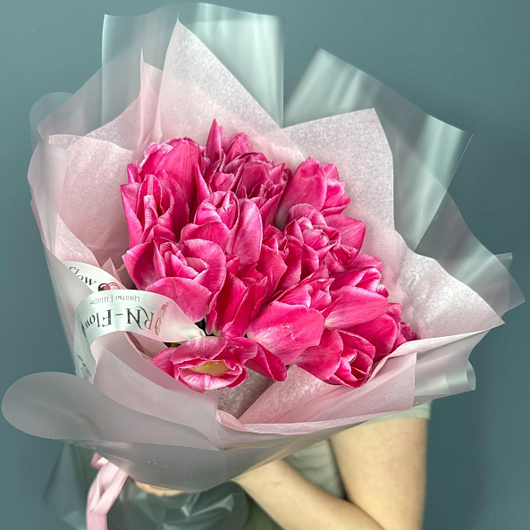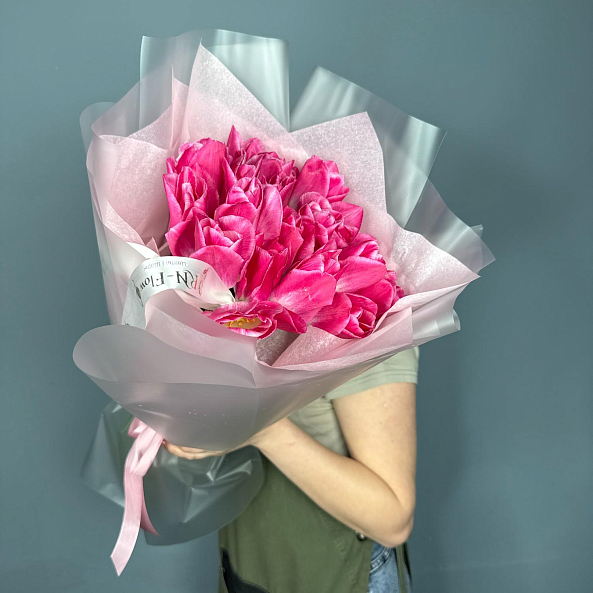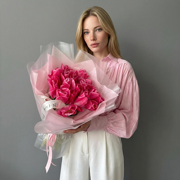 Этот изысканный букет из 21 розово-белых гладких тюльпанов — воплощение утонченной элегантности и минималистичной гармонии, словно застывший волшебный закат в пастельных тонах. Каждый лепесток, с его идеально гладкой текстурой и плавным переходом от нежного розового к чистому белому, дарит ощущение тепла и спокойствия, а аккуратные зеленые стебли придают композиции естественную свежесть. Упакованный в белую кальку с атласной лентой «RN-Flow», букет выглядит лаконично и стильно, идеально дополняя как повседневный образ, так и особый момент.