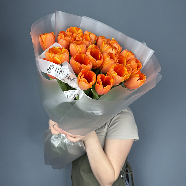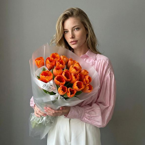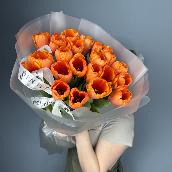 Этот изысканный букет из ярких оранжевых тюльпанов — настоящий взрыв энергии и тепла, словно застывший волшебный закат. Каждый лепесток, с его насыщенным солнечным оттенком и идеально гладкой текстурой, дарит ощущение жизненной силы, а плотная композиция создает объем, который завораживает с первого взгляда. Упакованный в современную серо-белую кальку с атласной лентой «RN-Flow», букет выглядит лаконично и стильно, идеально дополняя как романтический образ, так и торжественное мероприятие.