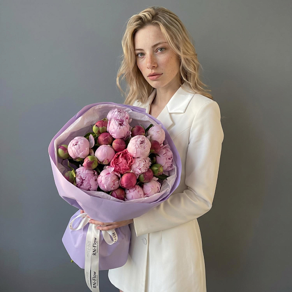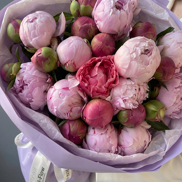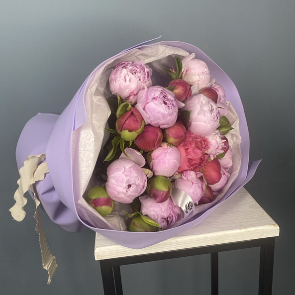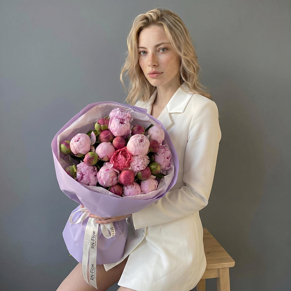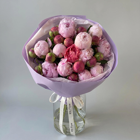 Букет «Розово-Коралловая Симфония: 25 Пионов в Миксе «Сара Бернар» и «Корал Сансет»»