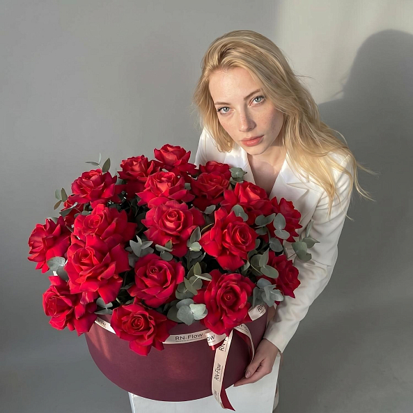 Букет «Эквадорская Элегантность: 27 Премиум-Роз «Эксплорер» (Франция) с Эвкалиптом в Коробке»