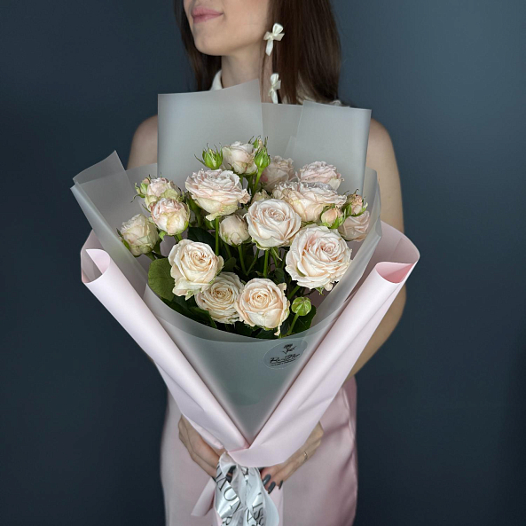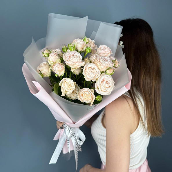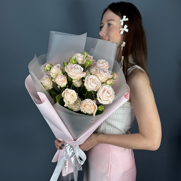 Нежный, утончённый букет из пионовидных роз с кремово-розовым оттенком. Идеален для первого признания, дружеского подарка или просто чтобы сказать: «Ты прекрасна». Лёгкий, воздушный, с ноткой романтики — как первое солнце весны.