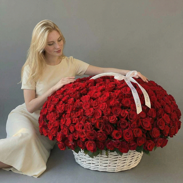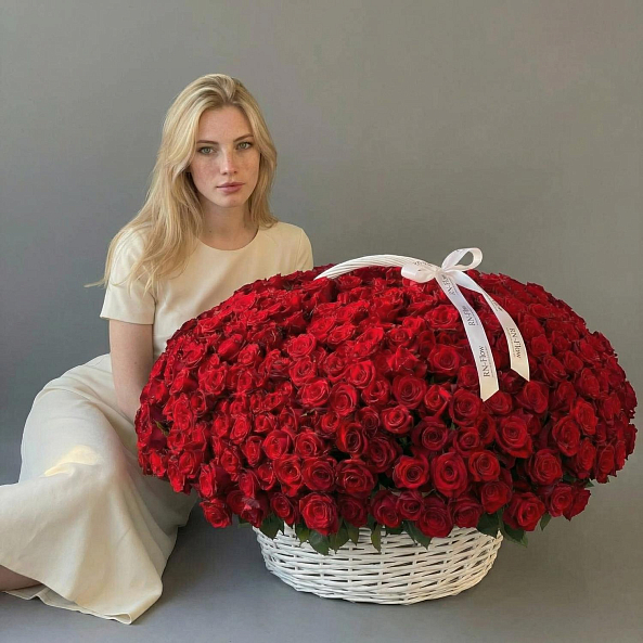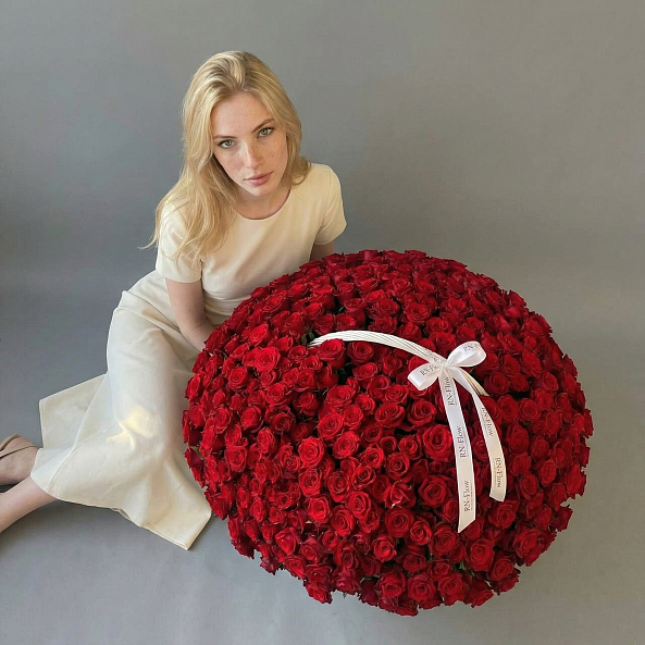 Этот монументальный букет — настоящая симфония безграничной страсти и вечной любви, где 501 насыщенная красная роза в идеальной форме создает роскошную, объемную композицию, словно застывший волшебный момент из самой романтической сказки.