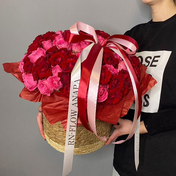 Розы аккуратно расположены в специальном аквавазе, который не только сохраняет их свежесть, но и позволяет с легкостью извлечь букет в любой момент, не нарушая композиции. Изящная корзина, выполненная в стиле современного минимализма, становится частью вашего пространства: после завершения цветения она легко преобразуется в элегантный элемент интерьера или практичный аксессуар для хранения. Ее мягкие линии и утонченный дизайн подчеркнут уют гостиной, спальни или кухни, а функциональность превратит ее в верного помощника в быту.
