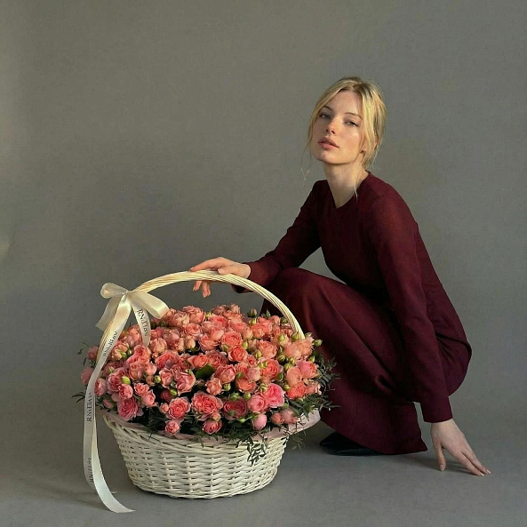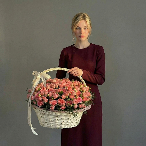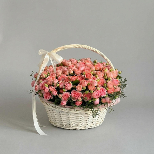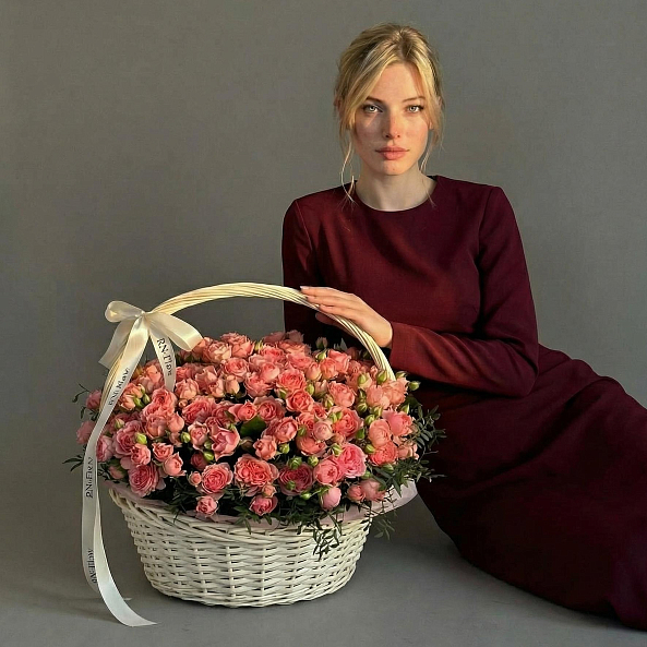Этот изысканный букет — настоящая симфония нежности и изысканности, где 51 пионовидная кустовая роза в оттенке «Спешл Дайменшн» создает объемную, пышную композицию, словно застывший волшебный рассвет в розовых тонах. Каждый бутон, от многослойных лепестков до свежих зеленых стеблей, дарит ощущение тепла и глубины чувств. Упакованный в белую плетеную корзину с лентой «RN-Flow», букет выглядит лаконично и стильно, идеально дополняя как романтический вечер, так и особый момент в жизни.