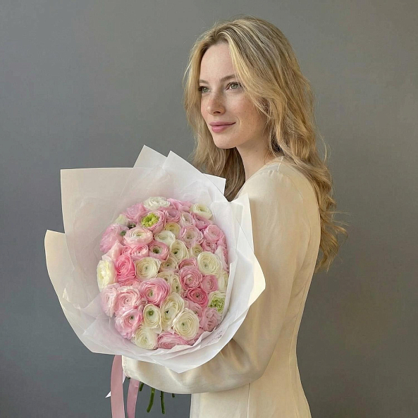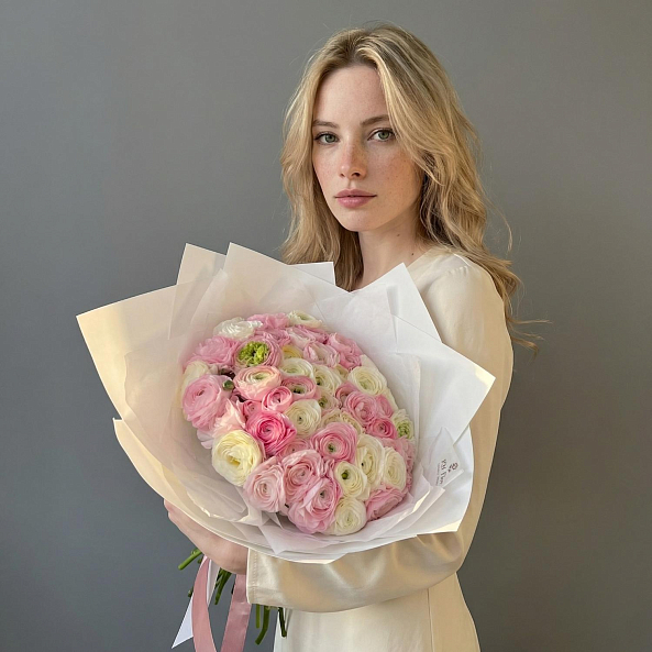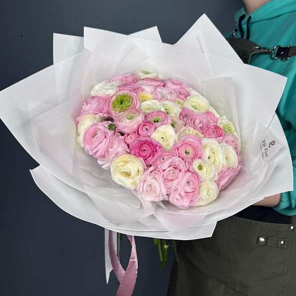 Ранункулюс — цветок, который поражает своей необычной формой бутонов и олицетворяет элегантность . Многослойные нежные лепестки с гофрированной текстурой придают букету особый шарм и объем. Эти цветы символизируют восхищение, привлекательность и очарование