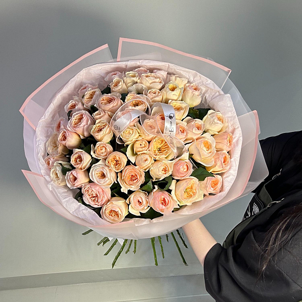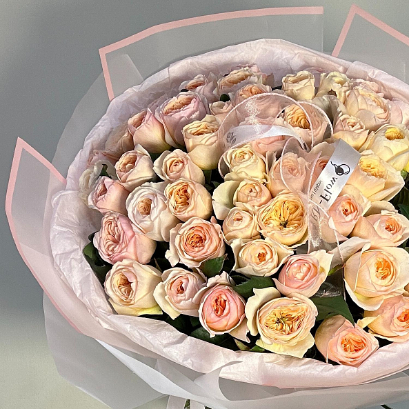 Этот изысканный букет — настоящая симфония нежности и эности, где розы «Джульета» пионовидной формы в оттенках персиково-розового создают объемную и гармоничную композицию. Каждый бутон, от пышных многослойных лепестков до свежих зеленых стеблей, словно застывший волшебный рассвет в пастельных тонах.