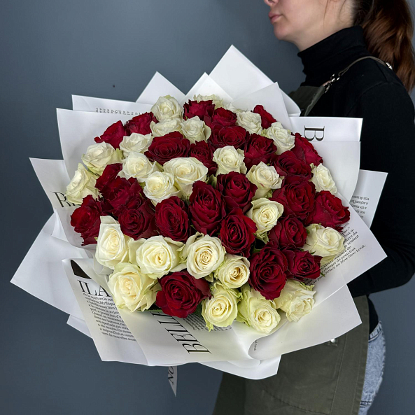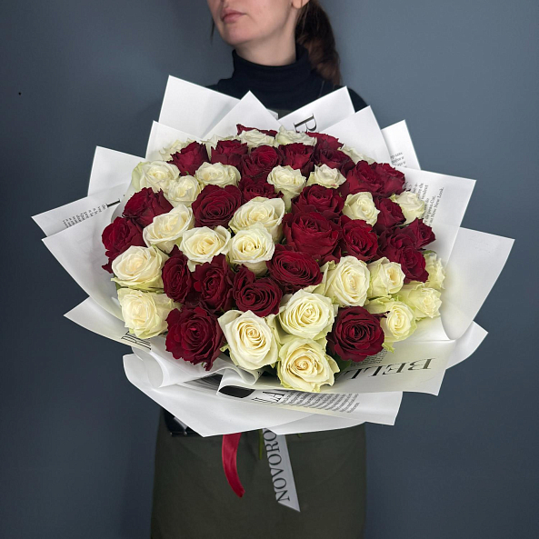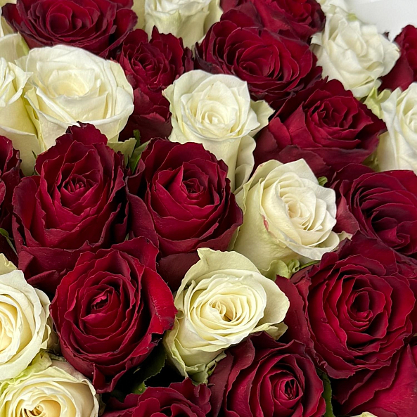 Букет из насыщенных бордовых и нежных белых роз — яркий контраст страсти и чистоты. Пышные бутоны, свежая зелень и элегантная упаковка создают гармоничную композицию для самого искреннего признания. Идеален для годовщины, Дня святого Валентина или просто чтобы напомнить: «Ты — моя любовь». (Для жены, для Любимой, Для Мамы, Для Подруги, Для Сестры)