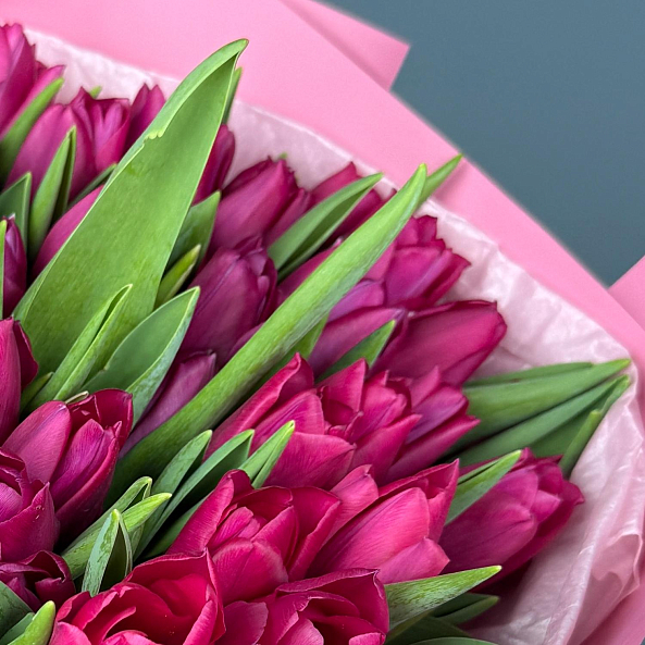 Этот изысканный букет из 51 темно-розовых гладких тюльпанов — воплощение утонченной элегантности и скромной страсти. Каждый лепесток, с его насыщенным оттенком, словно застывший в лучах закатного солнца, дарит ощущение тепла и глубины, а гладкая текстура подчеркивает роскошь и современный стиль. Плотно собранные в компактную композицию, тюльпаны создают образ минималистичной роскоши, который завораживает своей простотой и изысканностью. Упаковй в прозрачную кальку с атласной лентой «RN-Flow», букет выглядит лаконично и стильно, идеально дополняя как повседневный образ, так и особый момент.