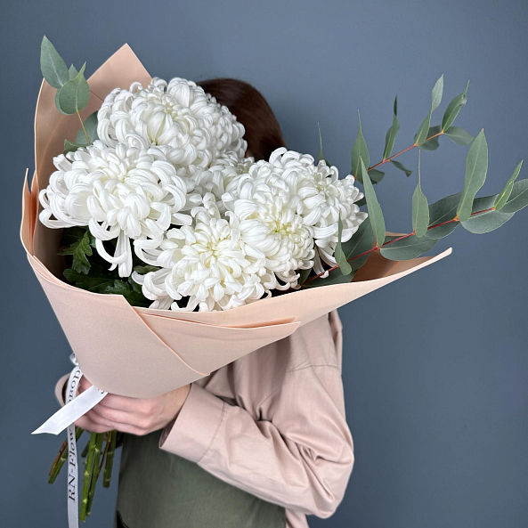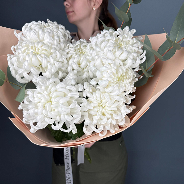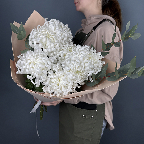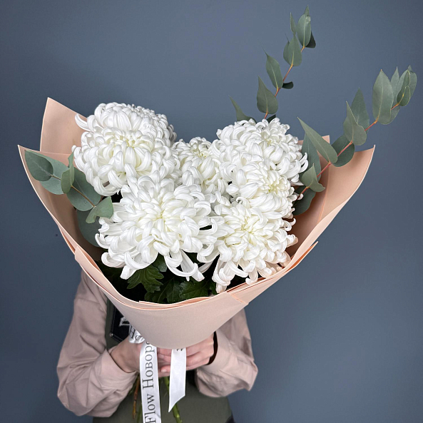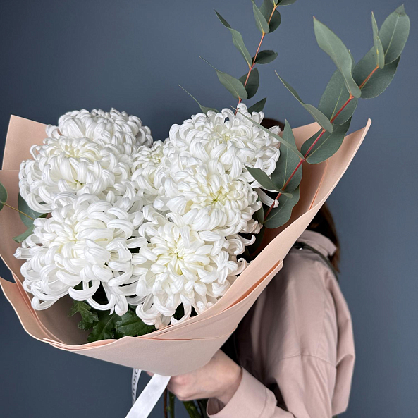 Пышные белые хризантемы и свежий эвкалипт — это не просто букет, а целая атмосфера. Идеален для тех, кто ценит простоту, доброту и гармонию.