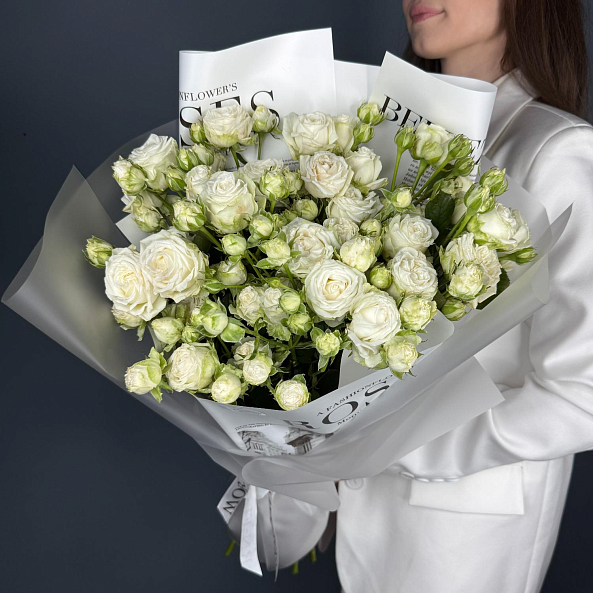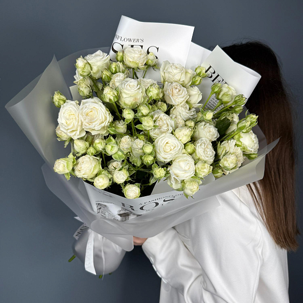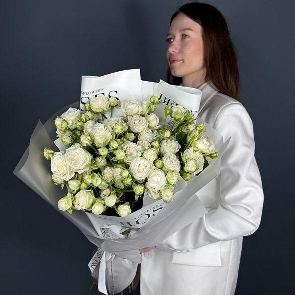 Нежный, воздушный букет из 7 белоснежных пионовидных кустовых роз с лёгким зелёным оттенком на бутонах. Идеален для тех, кто ценит чистоту, элегантность и утончённую простоту. Подарок для свадьбы, дня рождения или просто чтобы сказать: «Ты — мой свет».