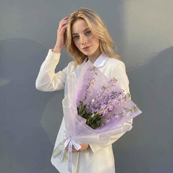 Этот изысканный букет — настоящая симфония гармонии и умиротворения, где 7 стеблей маттиолы «Пустошка Лаванда» в нежно-лавандовом оттенке создают объемную, ароматную композицию, словно застывший момент из самого спокойного уголка весеннего сада. Каждый стебель, от изящных лепестков до свежих зеленых стеблей, дарит ощущение тепла и глубины чувств, а нежный аромат, напоминающий о закатных ветрах, добавляет композиции магии.