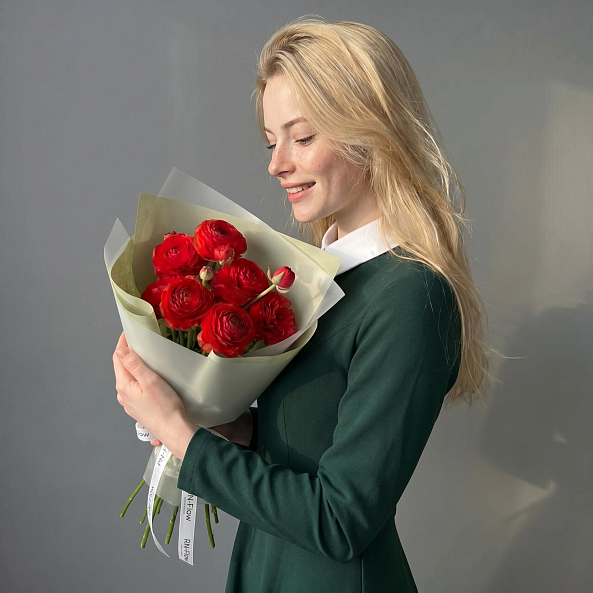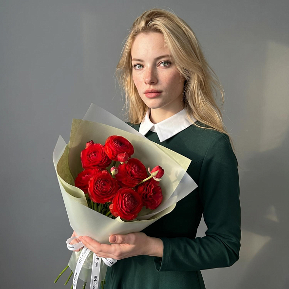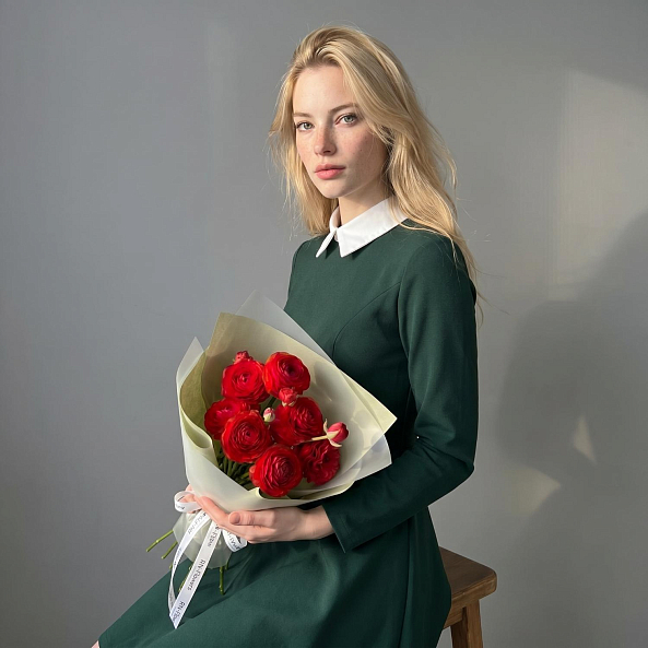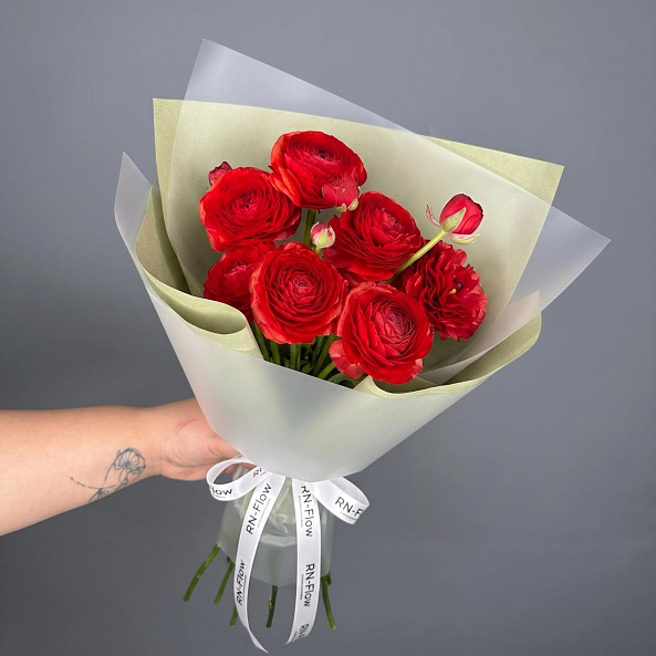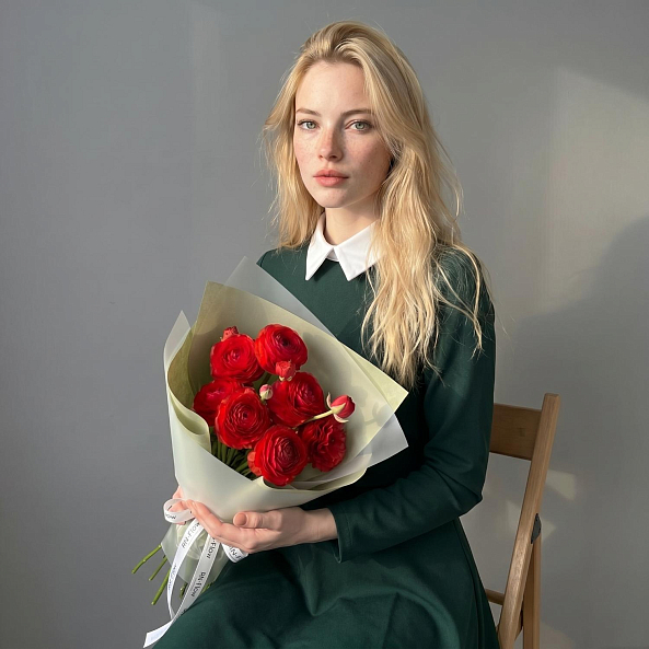 Этот изысканный букет — настоящая симфония очарования и страсти, где 7 мини-ранункулюсов (лютиков) в насыщенном багряном оттенке создают компактную, пышную композицию, словно застывший момент из самой романтической сказки. Каждый цветок, с его многослойными лепестками и бархатистой текстурой, дарит ощущение тепла и глубины чувств, а свежие зеленые стебли подчеркивают естественную гармонию.