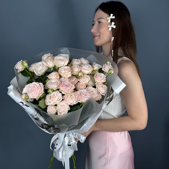 Нежный, утончённый букет из 7 пионовидных роз с кремово-розовым оттенком. Идеален для первого признания, дружеского подарка или просто чтобы сказать: «Ты прекрасна». Лёгкий, воздушный, с ноткой романтики — как первое солнце весны.