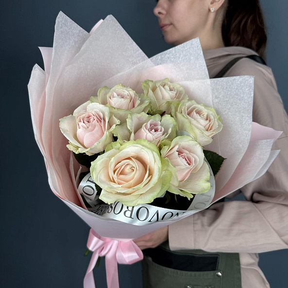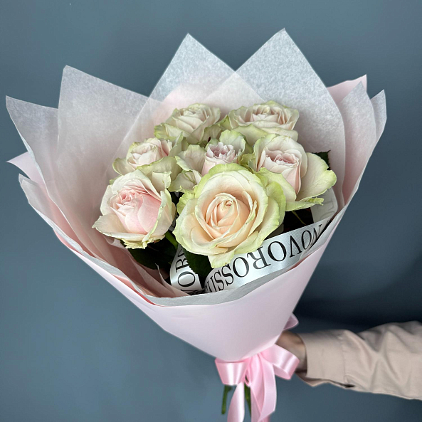 Нежный и утонченный букет из 7 роз «Свит Аваланж» (Грейси). Каждый бутон — это пастельное сочетание кремового, персикового и легкого зеленоватого оттенка на краях лепестков, создавая ощущение свежести и нежности. Композиция собрана в компактную, изящную форму и упакована в матовую бумагу с лентой — идеальный выбор для тех, кто ценит минимализм, элегантность и деликатность. Символ искреннего внимания и теплых чувств.