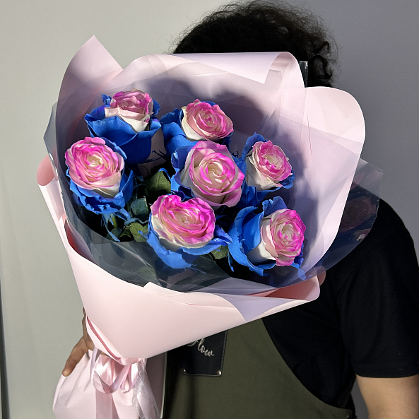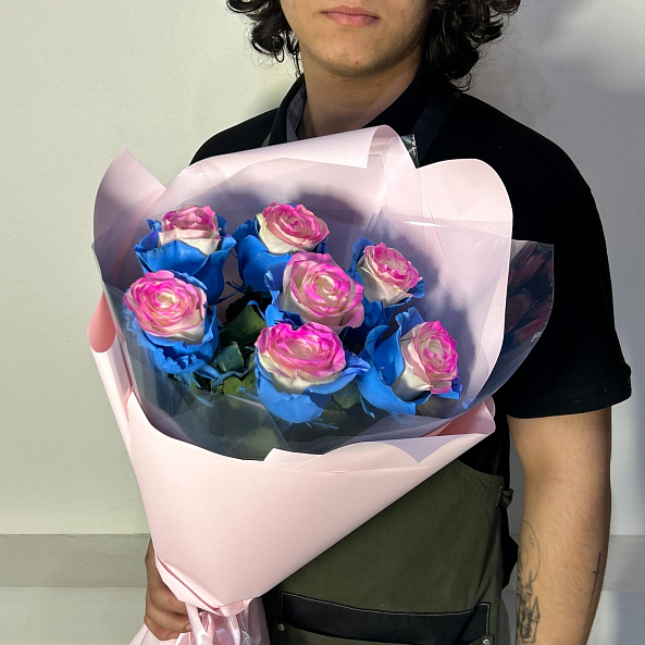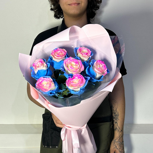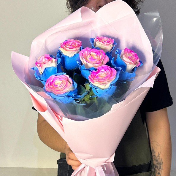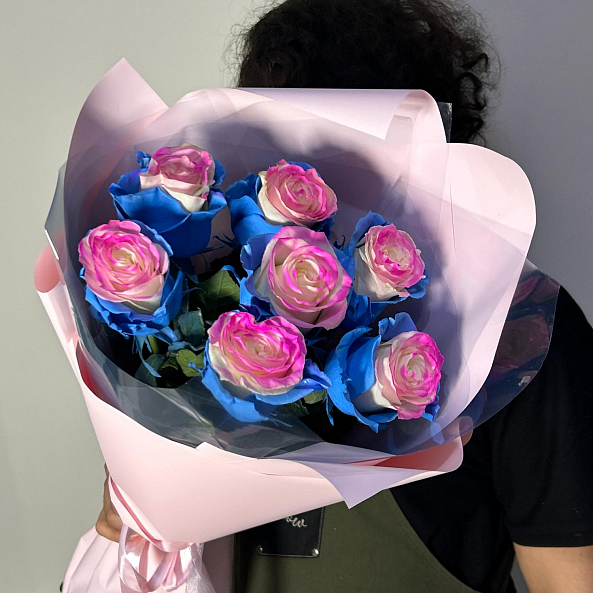 Розовые, голубые и кремовые переливы на одном бутоне — как будто закат и рассвет встретились в лепестках. Уникальный, сказочный, невозможный — идеален для подарка тем, кто ценит индивидуальность, смелость и волшебство.