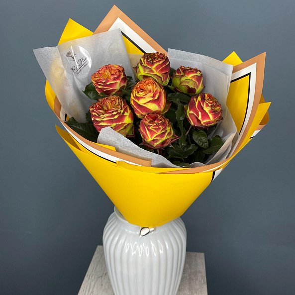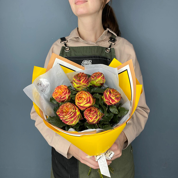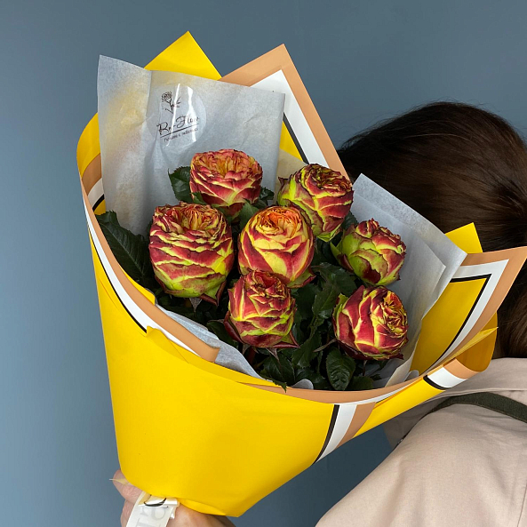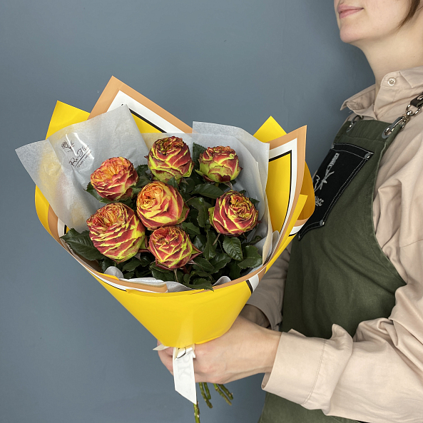 Яркая роза 40 см с пылающими оттенками оранжевого, красного и желтого — настоящий огонь страсти в одном бутоне. Идеальный выбор для тех, кто хочет подарить нечто запоминающееся и яркое.