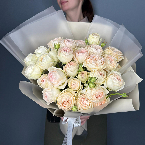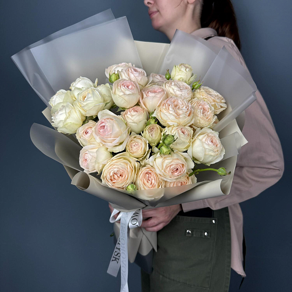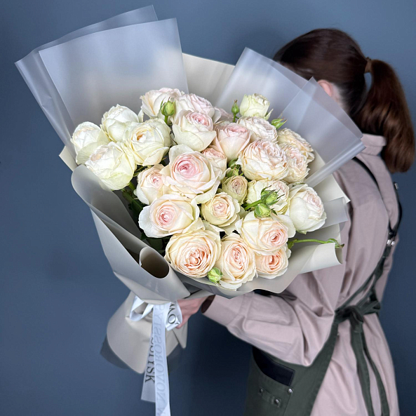 Нежный, уютный букет из семи роз с кремово-розовым оттенком — как облако из сахарной ваты. Пышные, мягкие бутоны создают ощущение тепла и нежности. Идеален для дня рождения, свидания или просто чтобы подарить улыбку — без слов, только с душой.
