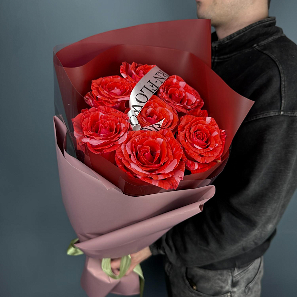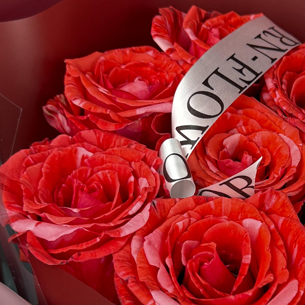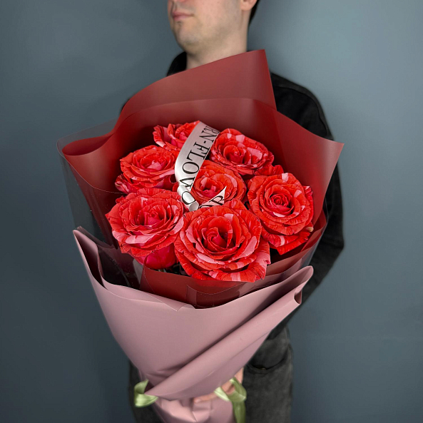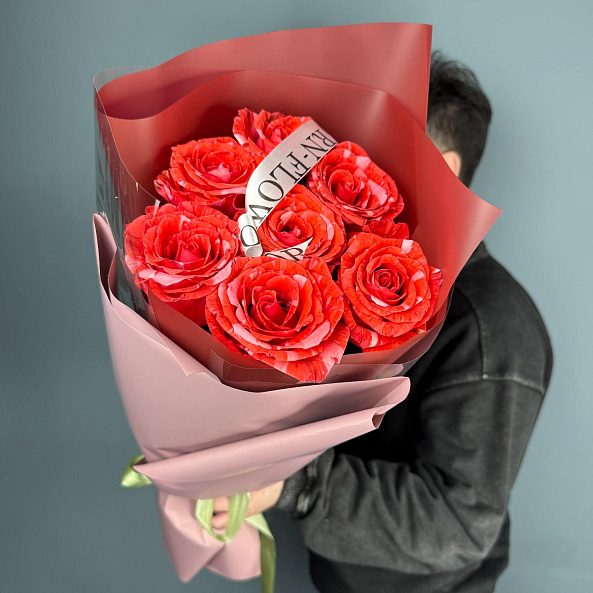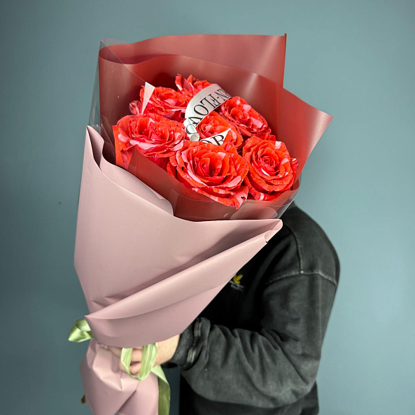 Яркие, насыщенные розы с нежно-розовыми прожилками — как будто природа решила создать шедевр. Каждая роза — уникальна: глубокий красный с нежными вкраплениями, словно мраморная венеция на лепестках. Идеален для романтического жеста, первого признания или подарка, который запомнится навсегда.