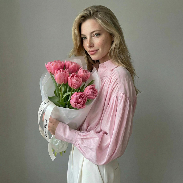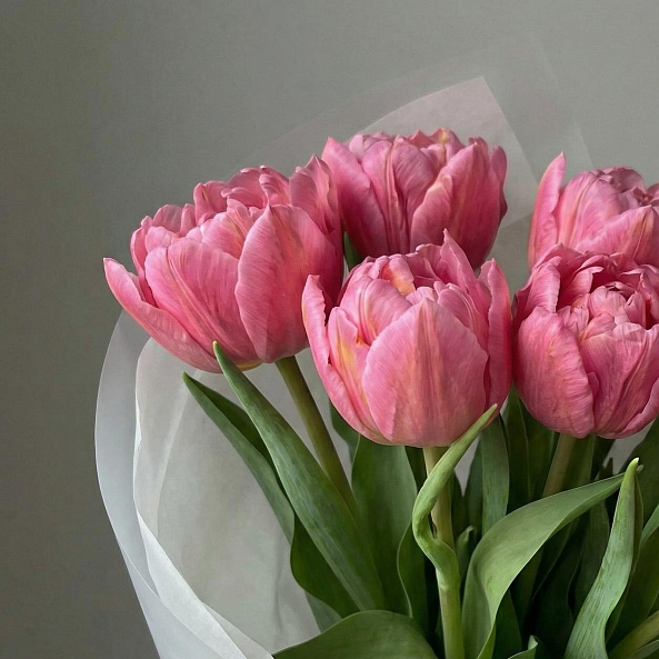 Этот изысканный букет из 7 розовых пионовидных тюльпанов — воплощение нежности и романтики, словно застывший волшебный момент из сказки. Каждый лепесток, с его пышной текстурой и нежным розовым оттенком, дарит ощущение тепла и уюта, а аккуратные зеленые стебли придают композиции естественную гармонию. Упакованный в прозрачную кальку с атласной лентой «RN-Flow», букет выглядит лаконично и стильно, идеально дополняя как повседневный образ, так и особый момент.